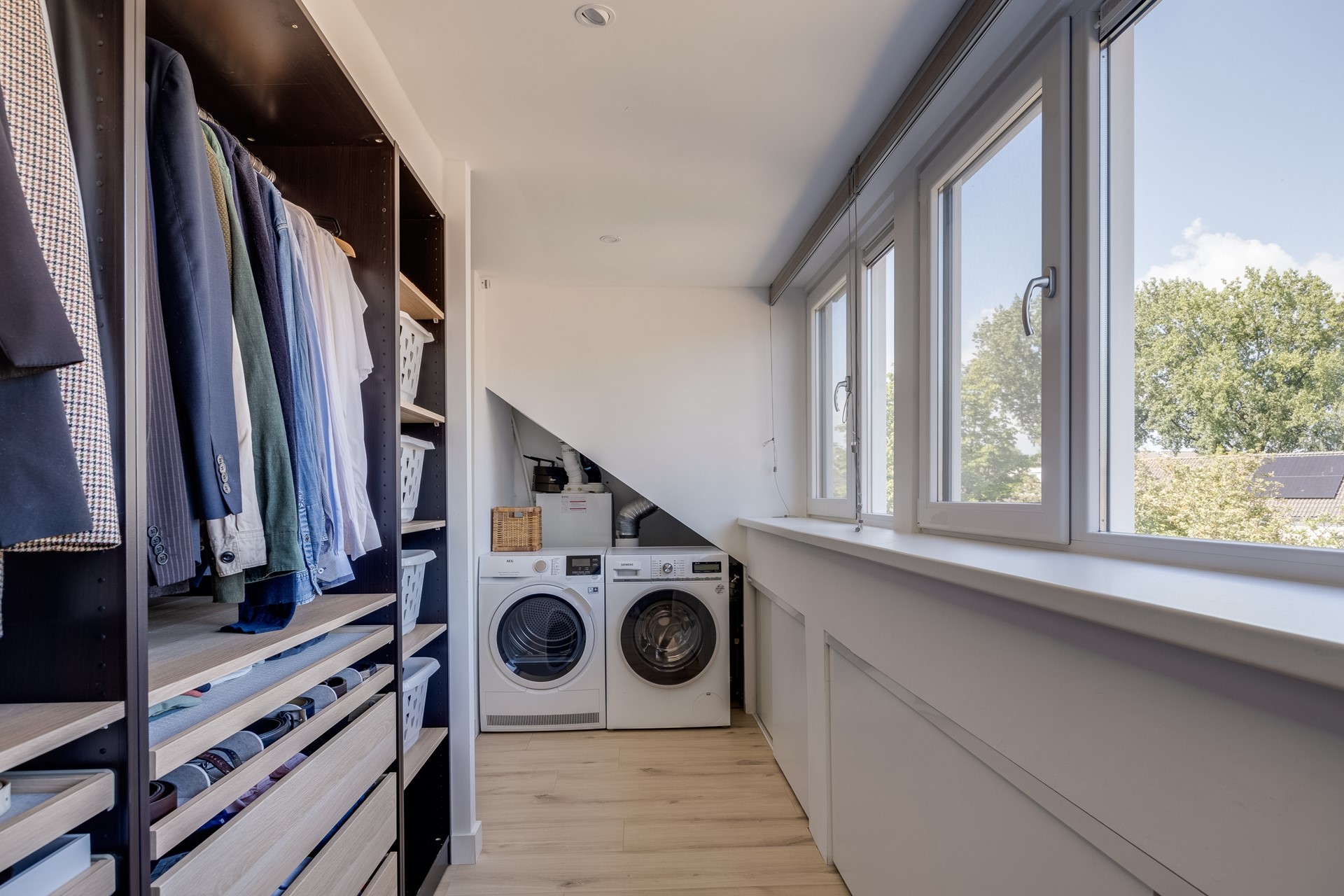 2e verdieping: Vaste trap naar geïsoleerde zolderverdieping. Deze ruimte is bijzonder ruim te noemen door de realisatie van twee dakkapellen over de volle breedte. Voorzolder met op maat gemaakte inloopkast, was- en droger opstelling en heerlijke 4e slaapkamer met airco. 2e badkamer met douche, wastafelmeubel en wandcloset.