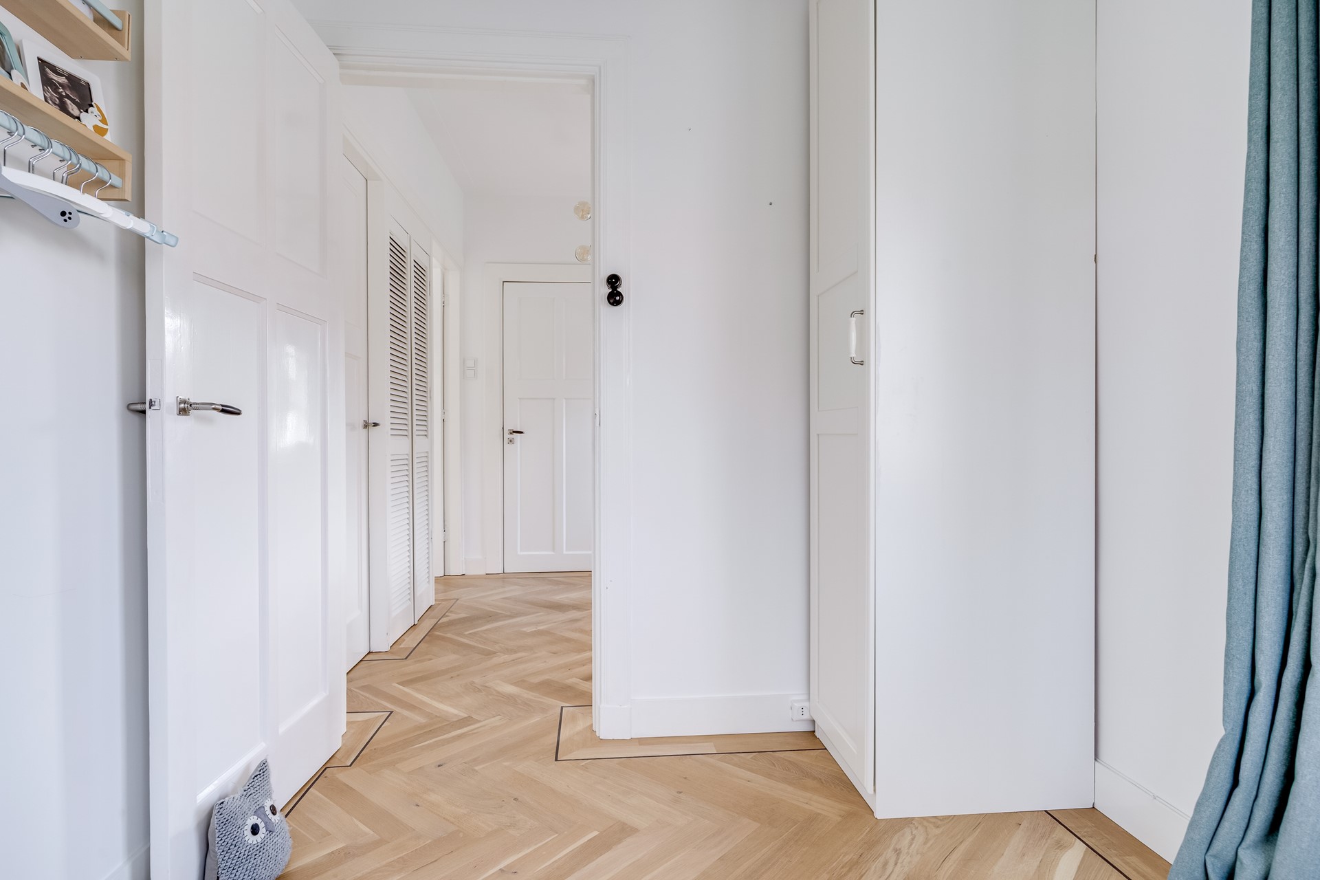Zij-entree, hal met fraaie granitovloer, garderoberuimte, toilet met fonteintje en doorgang naar sfeervolle kamer en suite met originele schuifdeuren, inbouwkasten en hoogwaardige visgraten parketvloer. Aan de voorzijde is er een fraaie erker en nog een extra ruimte, perfect als speelkamer of werkruimte. Aan de achterzijde bevindt zich de hoogwaardige woonkeuken met kookeiland en complete inbouwapparatuur. Tevens harmonicadeuren richting de verzorgde achtertuin.