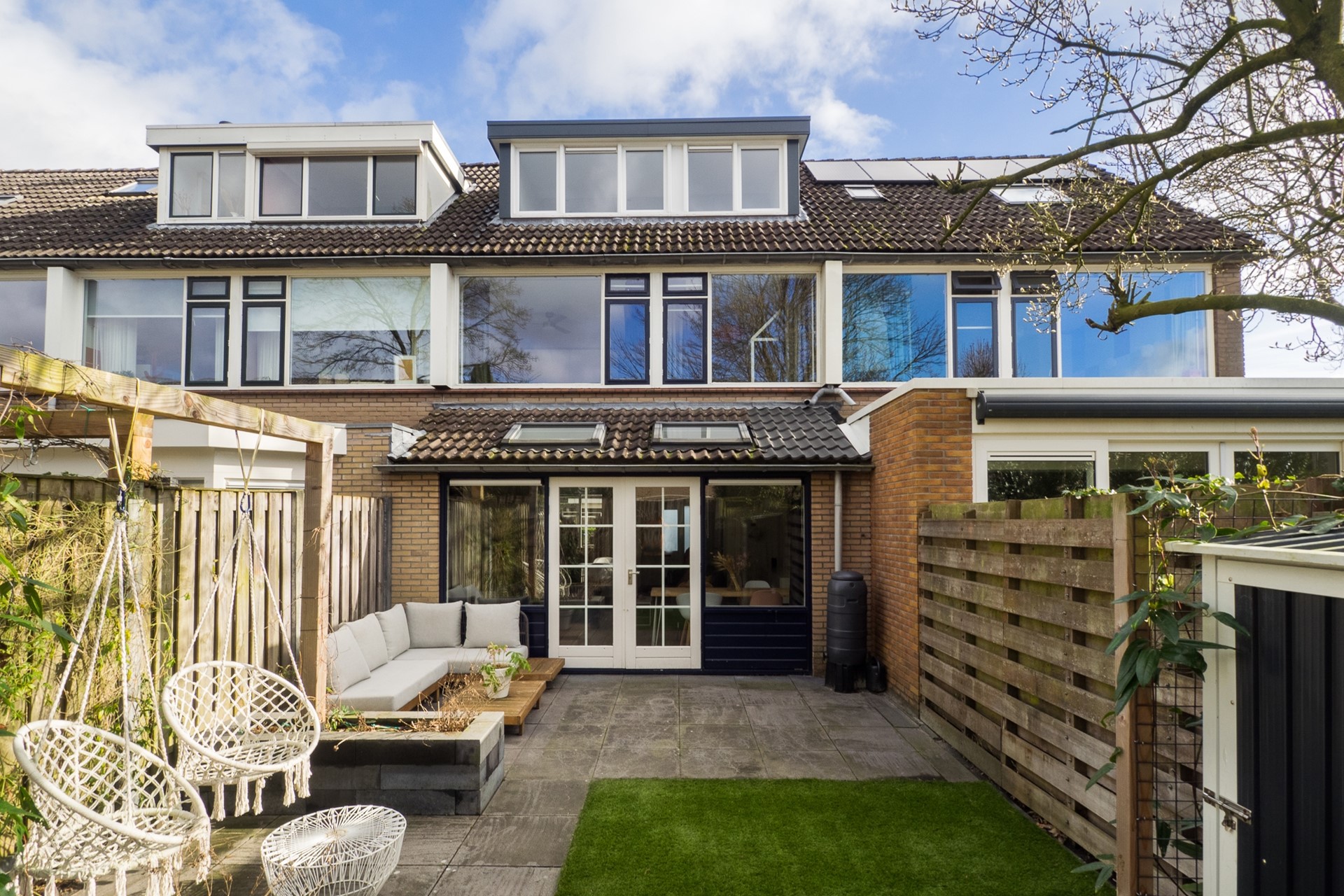 De achtertuin is verzorgd aangelegd en ondanks de gerealiseerde uitbouw voldoende ruim van opzet. Het geheel is voorzien van sierbestrating en kunstgras. Een eigen achterom completeert het geheel.