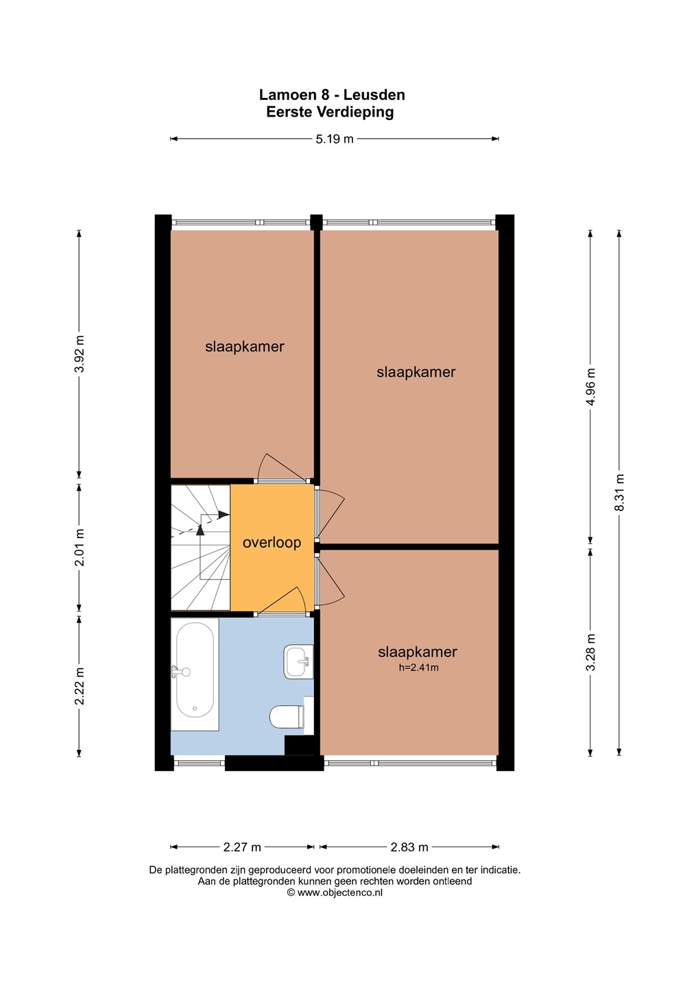 Overloop, 3 in grootte variërende slaapkamers waarvan er 2 aan de achterzijde en 1 aan de voorzijde is gelegen. Badkamer met bad/douche combinatie, wastafemeubel en 2e toilet.