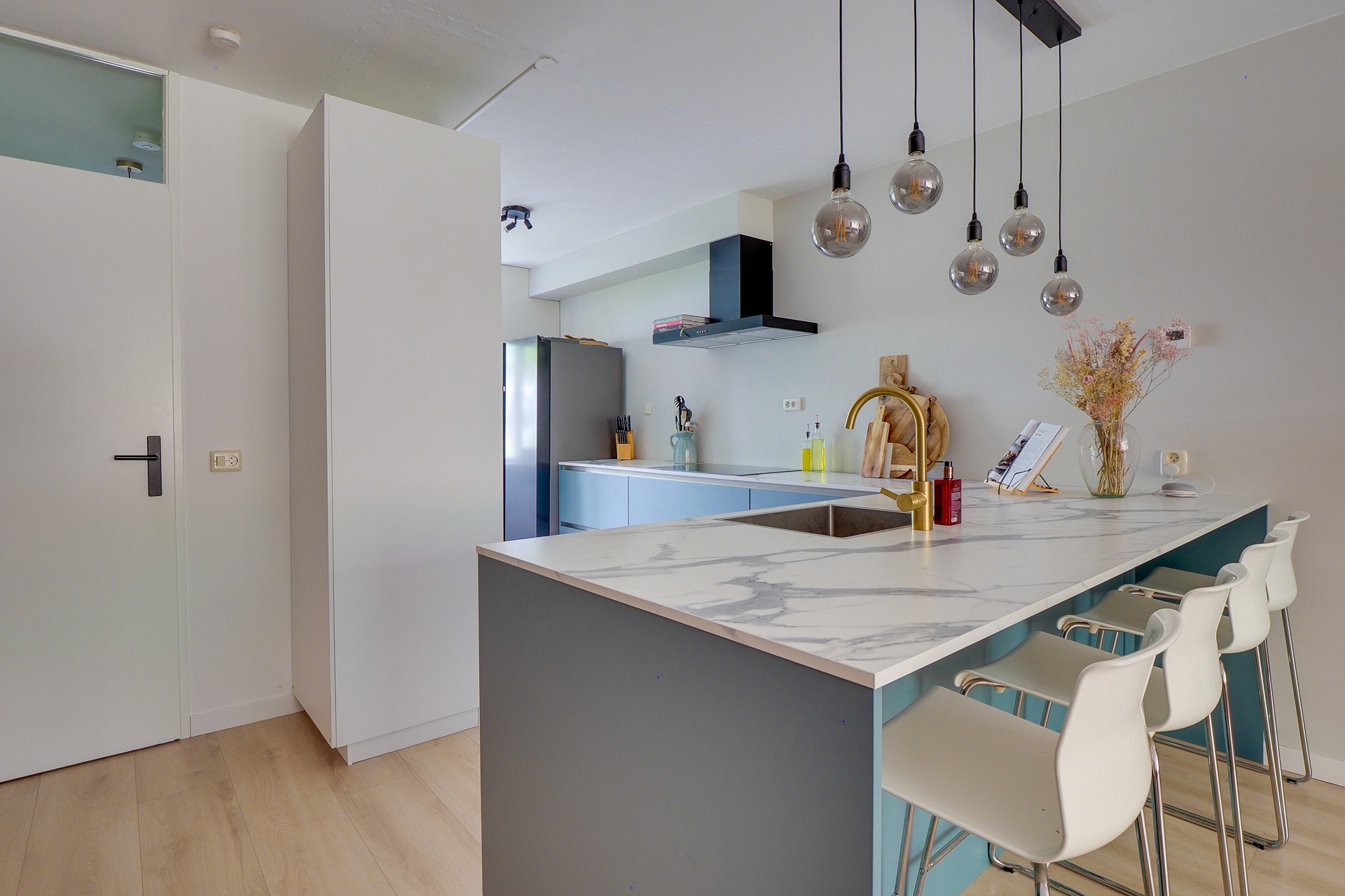 Dit appartement is onlangs compleet gerenoveerd en heeft een luxe afwerking. Bij binnenkomst word je direct getrakteerd op een gevoel van ruimte en licht. De moderne en nieuwe keuken is voorzien van hoogwaardige inbouwapparatuur, waardoor koken een waar genot wordt. Denk hierbij aan een amerikaanse koelkast met ingebouwde ijsklontjes dispenser, een AEG steamcrisp oven met pyrolyse reiniging en extra brede inductiekookplaat. De woonkamer is een uitnodigende ruimte met voldoende plaats voor een comfortabele zithoek en een eethoek om gezellige diners met vrienden en familie te organiseren.