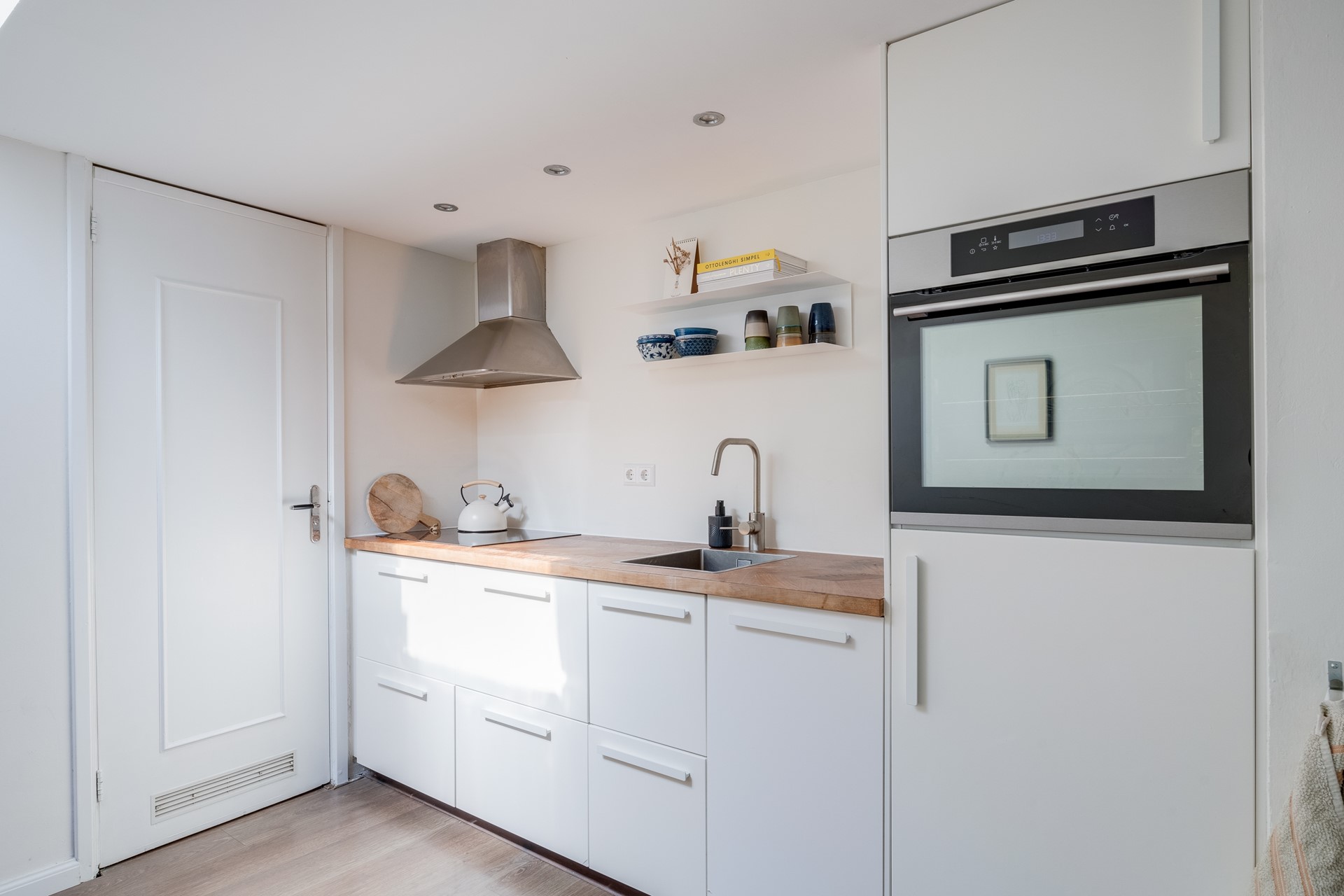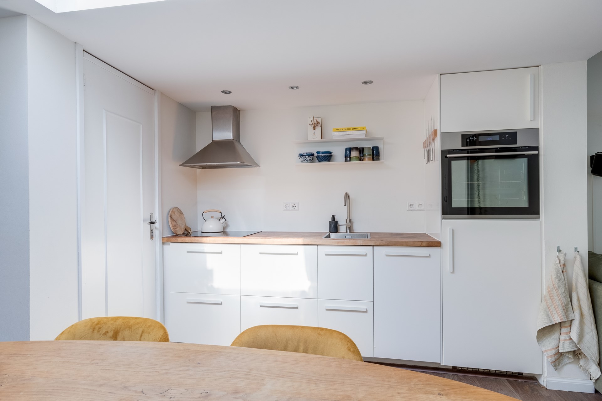 De frisse witte keuken (uit 2019) heeft een houten visgraat keukenblad en is voorzien van handige inbouwapparatuur zoals een 4-pits inductiekookplaat, afzuigkap, koelkast met vriezer en vaatwasser. Daarnaast is er voldoende opbergruimte in de lades en kastjes. Verlichting is geregeld door mooie inbouwspotjes, al komt er ook veel natuurlijk licht via de lichtkoepel binnen en dat maakt deze leefkeuken een enorm fijne plek om te zijn.