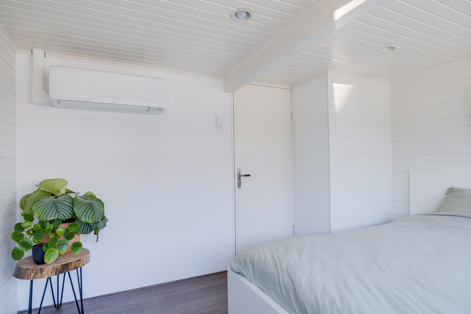 Naast de openslaande deuren naar de tuin is een kast te vinden waarin zich de CV-ketel bevindt en de wasmachine staat opgesteld. Dit is netjes weggewerkt.