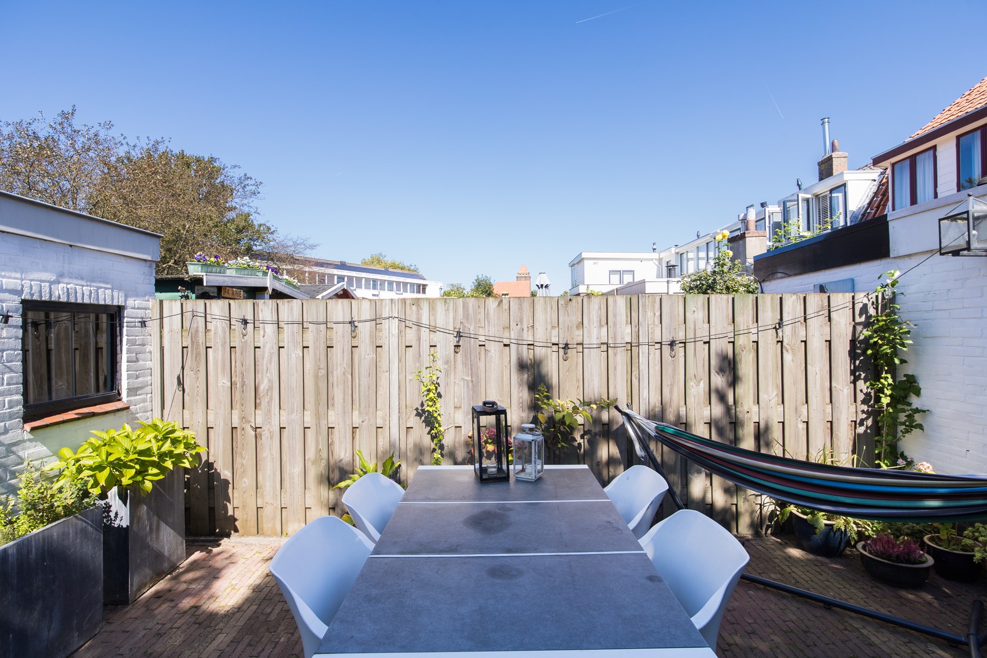 Een grote pré van deze woning is de royale tuin. Deze is niet alleen groot, maar ligt ook op het westen waardoor het er heerlijk zonnig is. Na werk, maar ook overdag kun je hier heerlijk van de zon genieten. De huidige bewoners eten zomers maar wat graag in tuin hun avondeten en liggen ’s middags graag in de hangmat in de zon. Er is daarnaast een ruime berging in de tuin en ook een achterom, ideaal voor je fiets. Doordat je niet veel achterburen hebt, heeft de tuin een breed uitzicht en er is voldoende ruimte voor meubilair of planten.