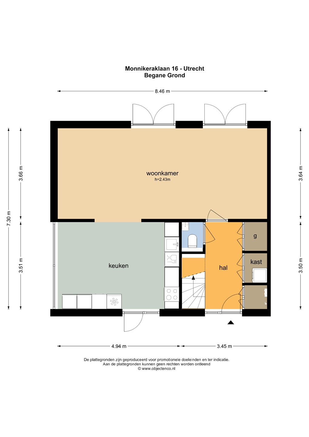 Entree, ruime hal, meterkast, toiletruimte v.v. hangend toilet met fontein, ruime garderobe, trapopgang naar de eerste verdieping, deur naar de woonkamer. De fraaie brede tuingerichte woonkamer is voorzien van een brede glaspartij met dubbele openslaande deuren naar de tuin. Vanuit de woonkamer bereik je de halfopen woonkeuken alwaar een comfortabele eettafel opstelling is gesitueerd. Deze complete en verzorgde keuken is geplaatst in een rechte opstelling met inbouwapparatuur. Vanuit de woonkeuken heb je leuk uitzicht op de voor- en zijtuin. De hele begane grond is voorzien van een mooie eikenhouten vloer (lamelparket) en lichte strakke wandafwerking.