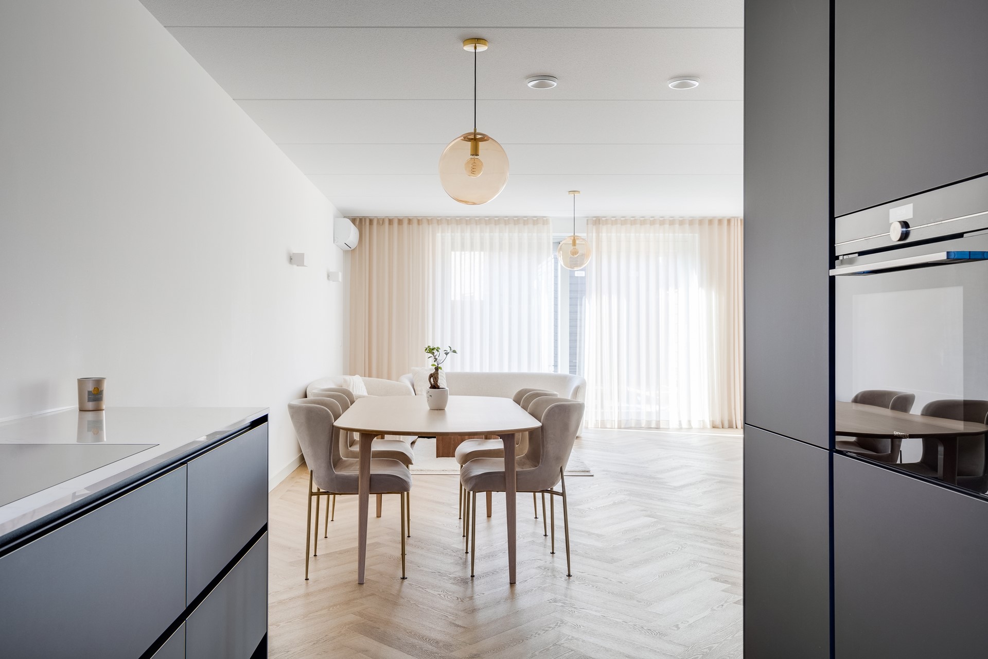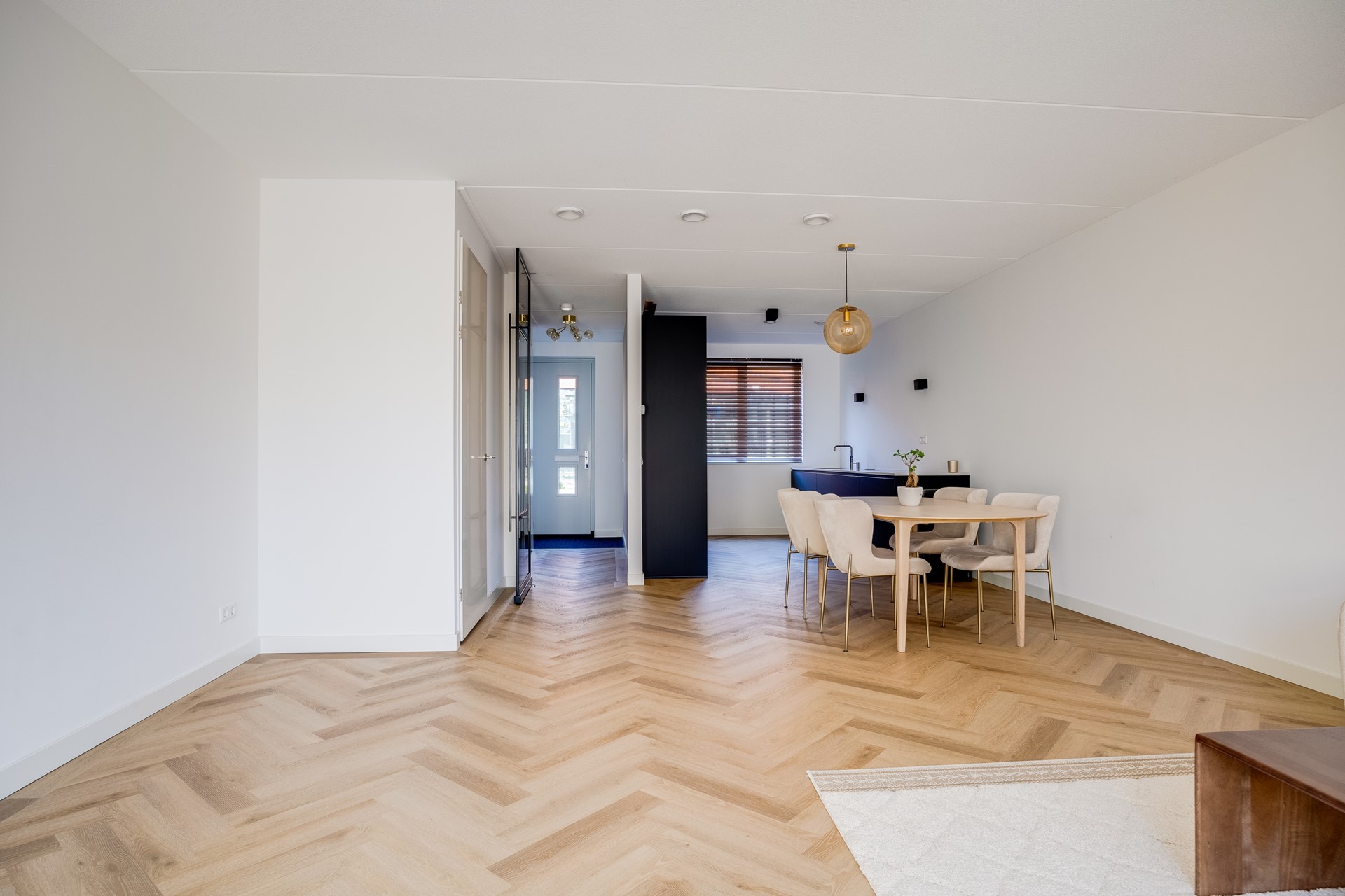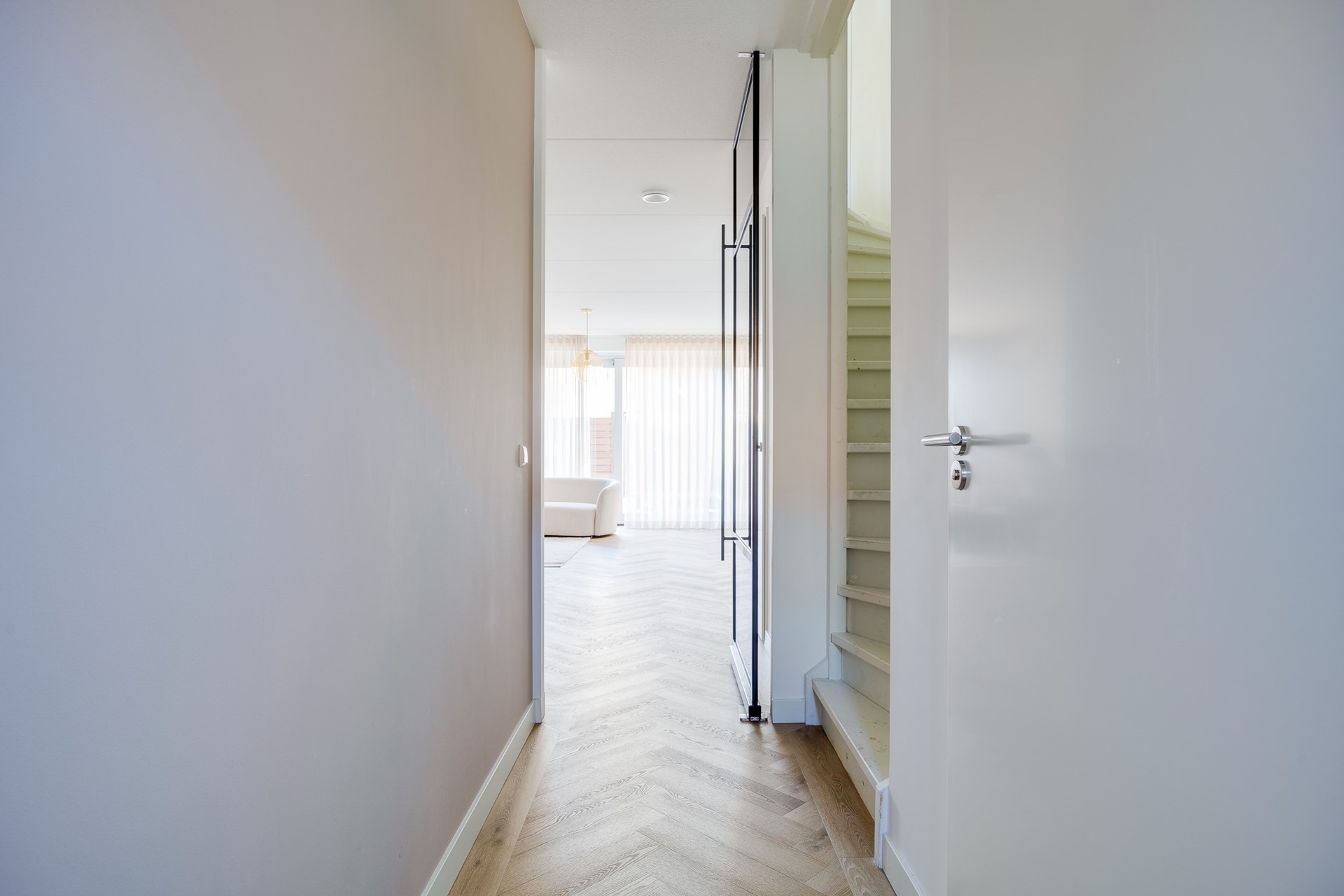 Entree, hal met meterkast, garderoberuimte, luxe toilet, trapopgang en middels stalen deur is er een doorgang naar tuin gerichte woon-eetkamer. De gehele begane grond is voorzien van hoogwaardige visgraten vloer met vloerverwarming, airco, schuifpui naar de tuin en staat in directe verbinding met de open keuken. Deze is aan de voorzijde gesitueerd, fraai 2-delig uitgevoerd en werkelijk van alle gemakken voorzien (o.a. quooker, Bora afzuiging etc).