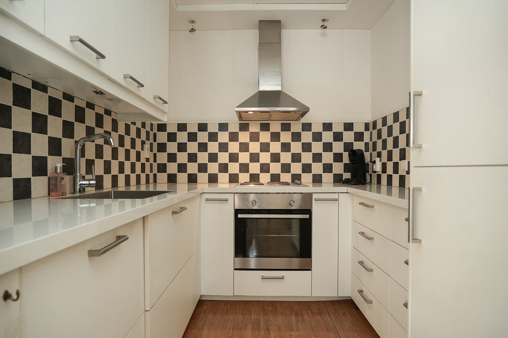 Entree, hal met garderoberuimte, toilet met fonteintje, badkamer met douche en vaste wastafel, bergkast met opstelling cv en aan de rustige tuinzijde 2 slaapkamers met zicht over het balkon en de gemeenschappelijke daktuin. Aan de voorzijde de ruimte, lichte woonkamer met directe toegang tot de open keuken welke is v.v. inbouwapparatuur.
